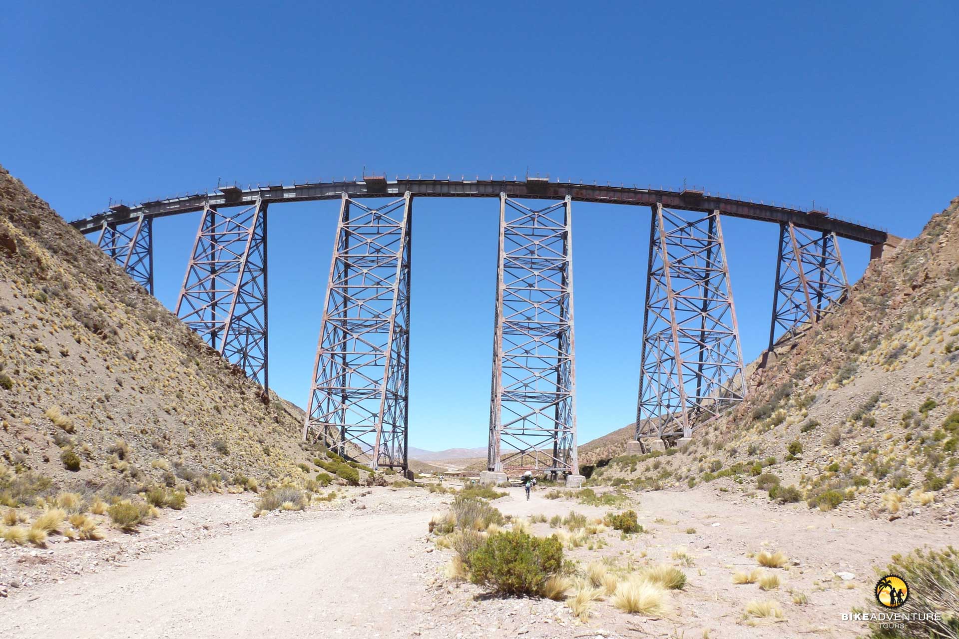 Wir haben noch nicht genug von der dünnen Luft. Wir biken auf der roten Piste durchs Hochland zum weltberühmten Viadukt «La Polvorilla». Eine technische Meisterleistung am Ende der Welt! Der Zug in die Wolken quert dort ein tief eingeschnittenes Tal. Auf dem Bahntrassee, auf den alten Geleisen geniessen wir den einmaligen Downhill zurück nach San Antonio und haben den Sechstausender Vulkan Acay immer im Blickfeld.