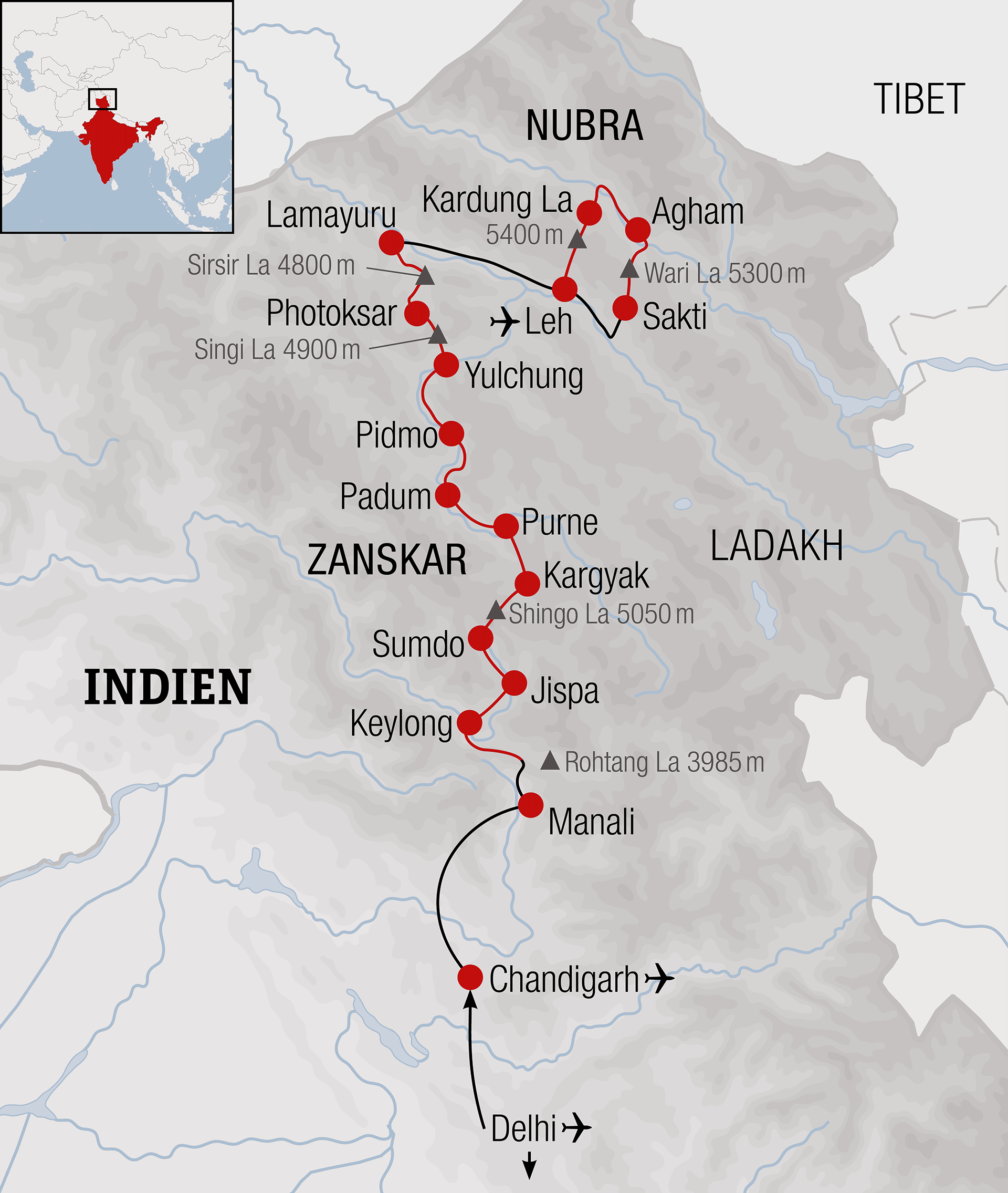 Von Delhi bringt uns ein Inlandflug nach Chandigarh. Von hier geht die Reise mit dem Bus weiter. Am Abend erreichen wir Manali, unseren Ausgangsort auf 1900 Metern. Nachdem wir den ersten Pass bequem durch das Tunnel abkürzen, geht es anschliessend nur noch per Bike weiter. Wir verlassen das Kulutal und erreichen über den 5050 Meter hohen Shingo das ehemalige Königreich Zanskar, welches bis in die Siebzigerjahre für Ausländer gesperrt war. Die Abgeschiedenheit und das unzugängliche Gelände liessen eine eigenständige Kultur entstehen, welche sich bis heute erhalten hat.
