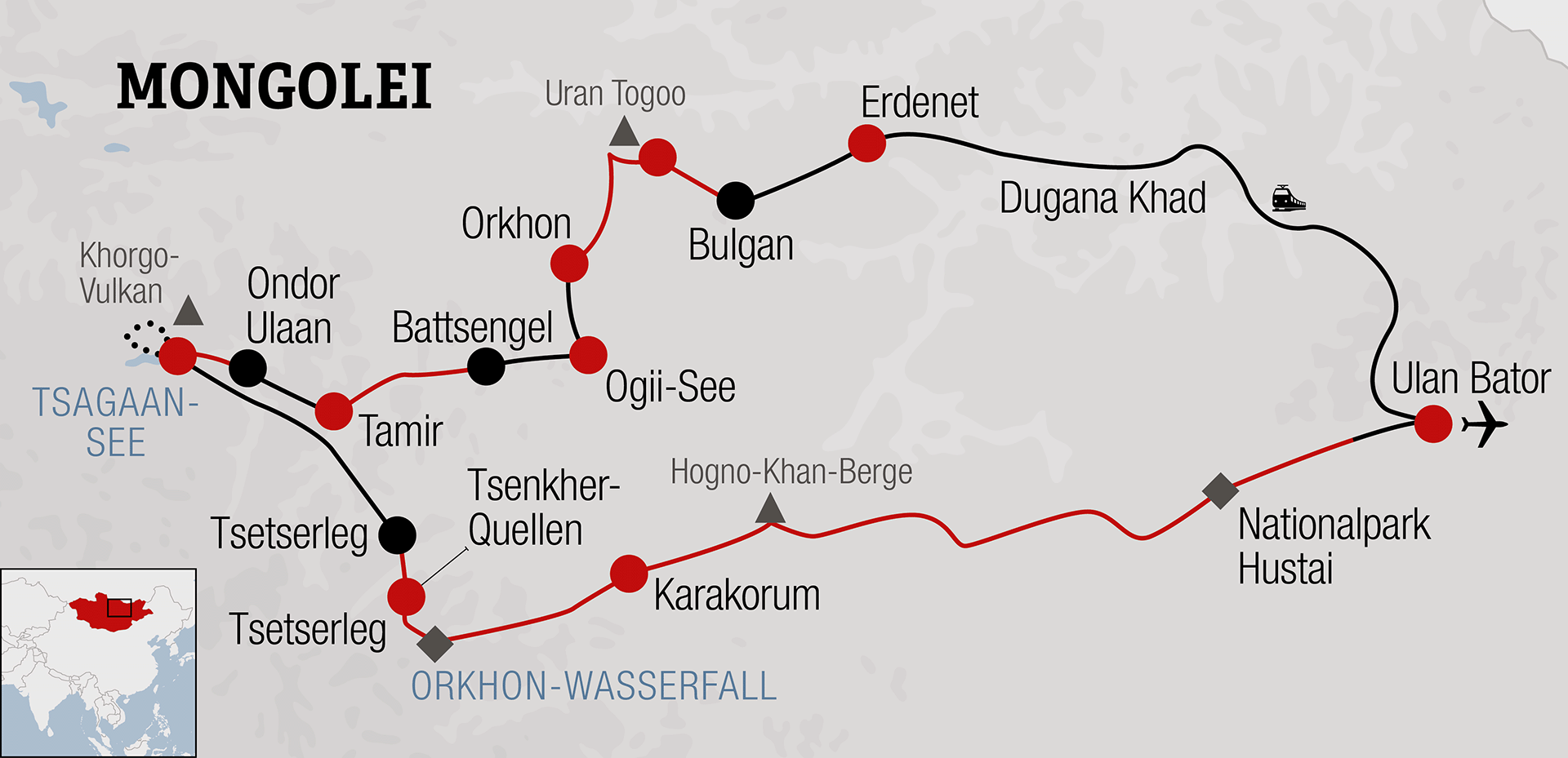 Diese atemberaubende Bikereise führt uns in die weite Steppen- und Hügellandschaft im Herzen der Mongolei. Durch die Provinzen Bulgan, Arkhangai und Töv radeln wir über saftige, blühende Wiesen, durch Steppengras, grüne Wälder, vorbei an fischreichen Seen und durch vulkanische Landschaften. Wir erleben die unendliche Weite und Ruhe der Mongolei. Meist übernachten wir in Jurtencamps und erhalten so einen Eindruck, wie die Nomaden seit Jahrhunderten leben. Herzliche Begegnungen mit der mongolischen Bevölkerung, die meist zu Pferd unterwegs ist, bereichern die Reise zusätzlich. Die Landschaft ist überwältigend schön, erstaunlich abwechslungsreich und für uns gleichzeitig fremdartig. Die reine Luft und praktisch verkehrsfreie Strassen und Wege machen das Radfahren zum Genuss. Dank den robusten 4×4 Begleitfahrzeugen gelangen wir auch in abgelegene Gebiete und können landschaftlich unterschiedliche Gegenden dieses riesengrossen Landes entdecken. Eine Reise der Superlative für Biker*innen, die das Aussergewöhnliche suchen.