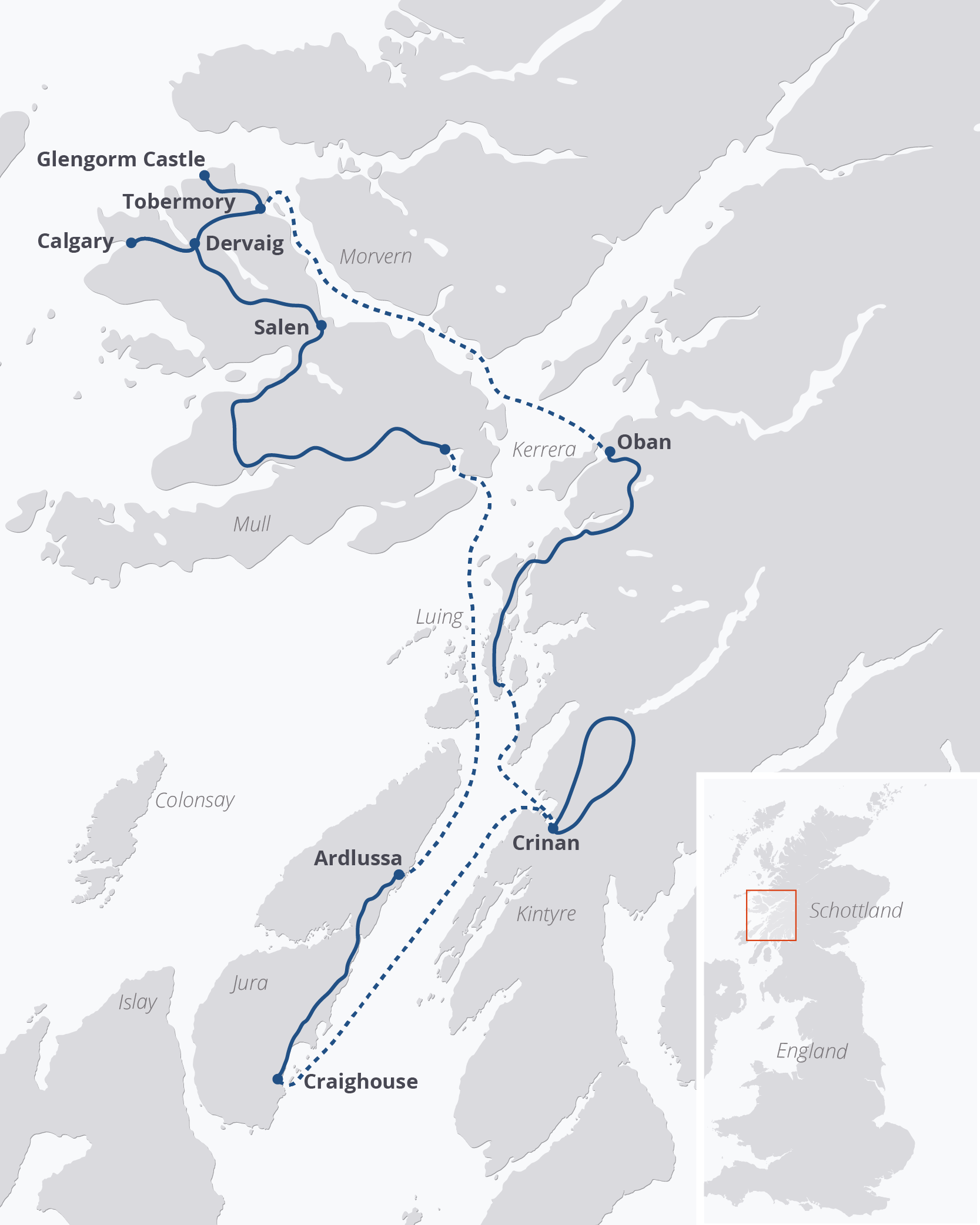 Oban ist Start- und Endpunkt Ihrer Reise zu den Inneren Hebriden und den Highlands. Sie besuchen mit der Flying Dutchman die Insel Mull, die zu den landschaftlich spektakulärsten Gebieten Schottlands zählt und vom Tourismus noch weitgehend unberührt ist. Die ebenfalls besuchte Insel Jura ist für Ihren reichen Bestand an Rotwild bekannt und in ihrer gleichnamigen Destillerie wird ein weltbekannter Whisky produziert.
