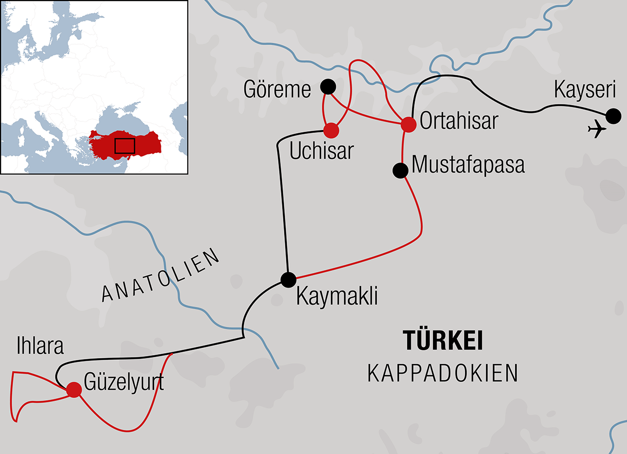 Eine Reise nach Kappadokien lässt jedes Entdeckerherz höherschlagen. Unglaublich, was dieser kleine Flecken in Zentralanatolien dem Gast offenbart: Felslandschaften in allen erdenklichen Formen und Farben, Hunderte von Felsenkirchen, Tausende von Höhlenwohnungen und Dutzende von Untergrundstädten. Dazu die angenehme Gastfreundschaft mit interessanten Höhlenhotels und der feinen türkischen Küche. Auf dieser Reise spielen das technische Können und die Kondition jedes Einzelnen eine weniger grosse Rolle. Dies, weil sogar das Warten in den Felsen Spass macht und öfters zu einer kleinen Zusatzschlaufe einlädt. Wir durchfahren die schönsten Täler, erklimmen sanfte Hügel und machen einen Abstecher über die weiten Felder zur Ihlara-Schlucht. Und immer wieder geniessen wir die sprichwörtliche Gastfreundschaft der Türken.