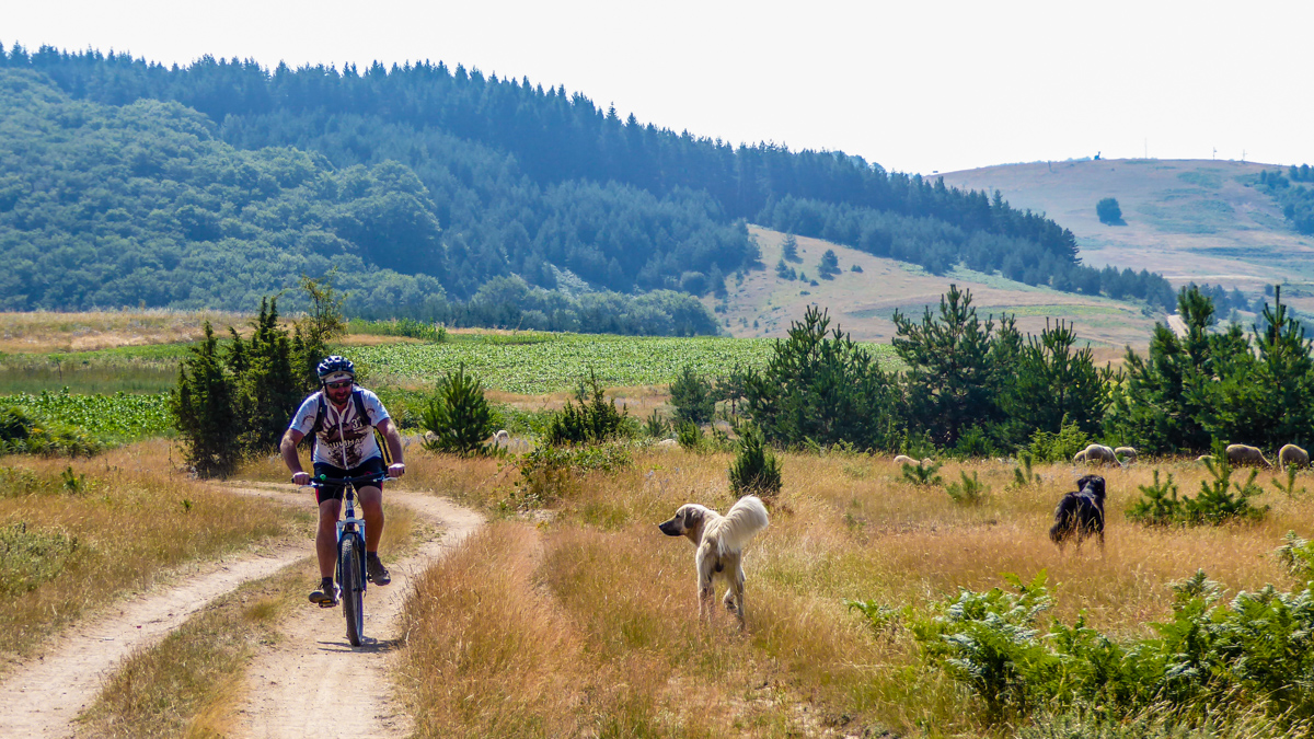 Die Touren verlaufen auf alten Hirten- und Wirtschaftswegen, die nur selten als Bike-Routen ausgeschildert sind und sich selbst überlassen werden. «Das gehört zu unserem Konzept», sagt Slobodan Trajkovski. «Es gibt genügend Destinationen mit gewarteten oder künstlich angelegten Trails. Hier findet man noch Ursprünglichkeit und Wildnis.» So kommt es vor, dass die Biker auf einem überwucherten Weg zuerst Brombeerranken wegräumen müssen oder den Pfad im Steppengras suchen müssen. Gelegentlich trifft die Gruppe in der Einsamkeit auf Schafherden. Laut kläffend preschen Hirtenhunde heran. Der Guide heisst die Biker stillzustehen, bis der Hirte die Hunde zurückpfeift. Dann können sie ihre Zweiräder durch die Herde schieben wie durch ein wogendes Meer aus Wolle.